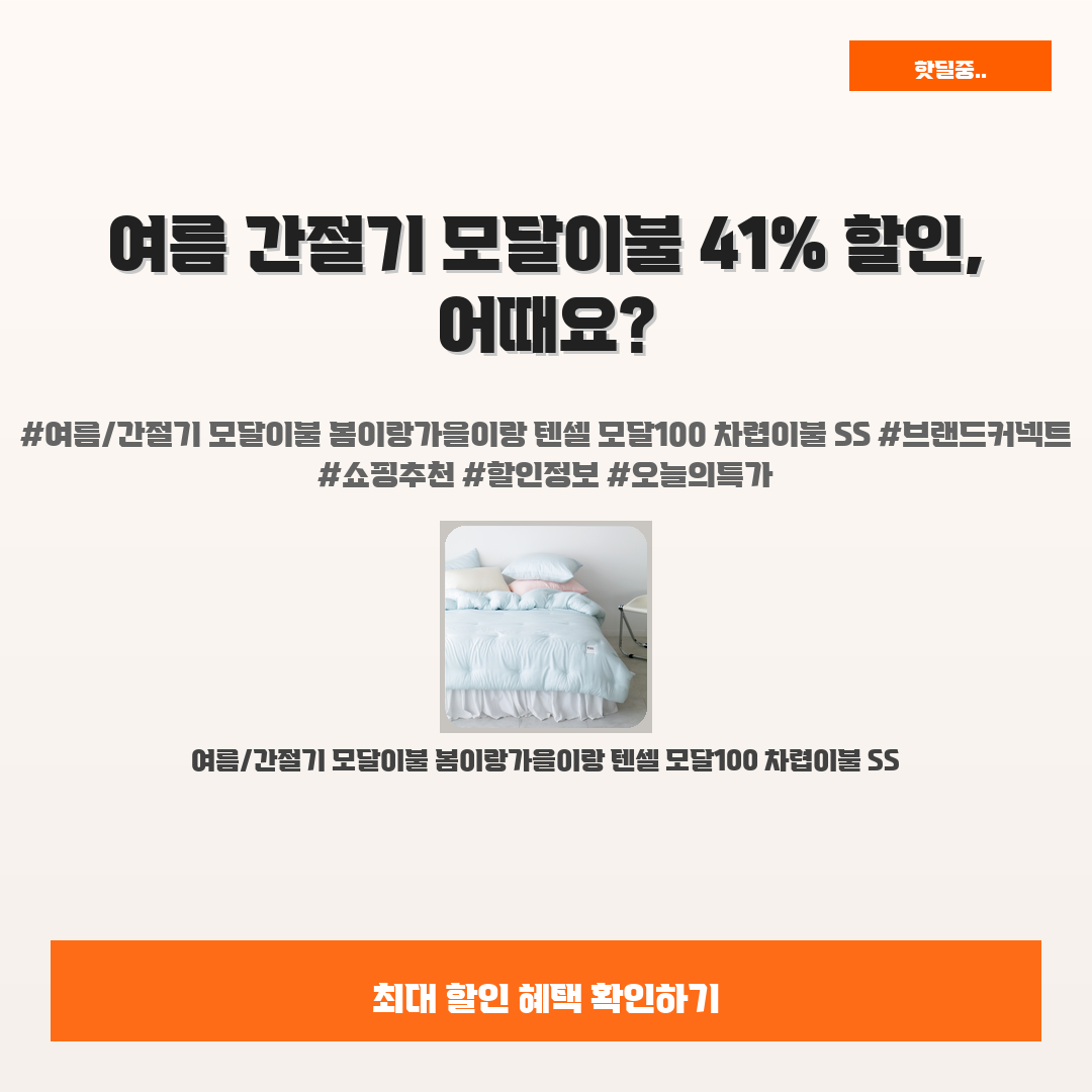 🛍️ 이 포스팅은 네이버 쇼핑 커넥트 활동의 일환으로,판매 발생 시 수수료를 제공받습니다.여름/간절기 모달이불 봄이랑가을이랑 텐셀 모달100 차렵이불 SS41% 119,600원69,900원베이직톤 지금 구매하기 → ⭐ 여름/간절기 모달이불 특징 및 장점여름/간절기 모달이불 봄이랑가을이랑 텐셀 모달100 차렵이불 SS의 핵심 특징을 한눈에 정리해드립니다.💡 주요 특징첫째, 텐셀 모달 100% 원단으로 부드러운 감촉과 뛰어난 통기성을 제공합니다.둘째, 여름과 간절기에도 적합한 차렵이불로, 가벼운 무게와 적절한 열 조절 기능이 장점입니다.셋째, 손쉬운 세탁과 관리가 가능하여 언제든지 깔끔한 상태를 유지할 수 있습니다.넷째, 다양한 침대 스타일에 잘 어울리는 세련된 디자인으로 인테리어 효과를 높입니다.📋 ..
